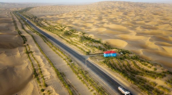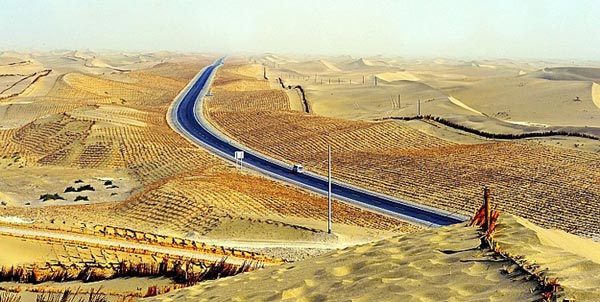 Ο εθνικός δρόμος Tarim Desert Highway διασχίζει την έρημο Τακλαμακάν στην Κίνα. Το συνολικό μήκος της οδού είναι 552 χιλιόμετρα, εκ των οποίων περίπου τα 446 περνούν από ακατοίκητες περιοχές, ενώ οι οδηγοί διασχίζουν αμμόλοφους και θίνες που πολλές φορές φτάνουν και τα 20 μέτρα σε ύψος, θάβοντας στην κυριολεξία σε πολλά σημεία το δρόμο.