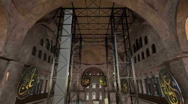 Ο υπουργός Τουρισμού και Προβολής της Τουρκίας, Μεχμέτ Νουρί Ερσόι έδωσε στην δημοσιότητα βίντεο που δείχνει βήμα – βήμα πώς θα πραγματοποιηθούν οι εργασίες στην Αγία Σοφία. Σύμφωνα με τον Μεχμέτ Νουρί Ερσόι, θα τοποθετηθεί μία σιδερένια πλατφόρμα ύψους 43,5 μέτρων στους 4 μεγάλους πεσσούς (κτιστούς τετράγωνους στύλους) προκειμένου για να γίνουν οι εργασίες και ταυτόχρονα η Αγία Σοφία να συνεχίσει να λειτουργεί ως τέμενος.