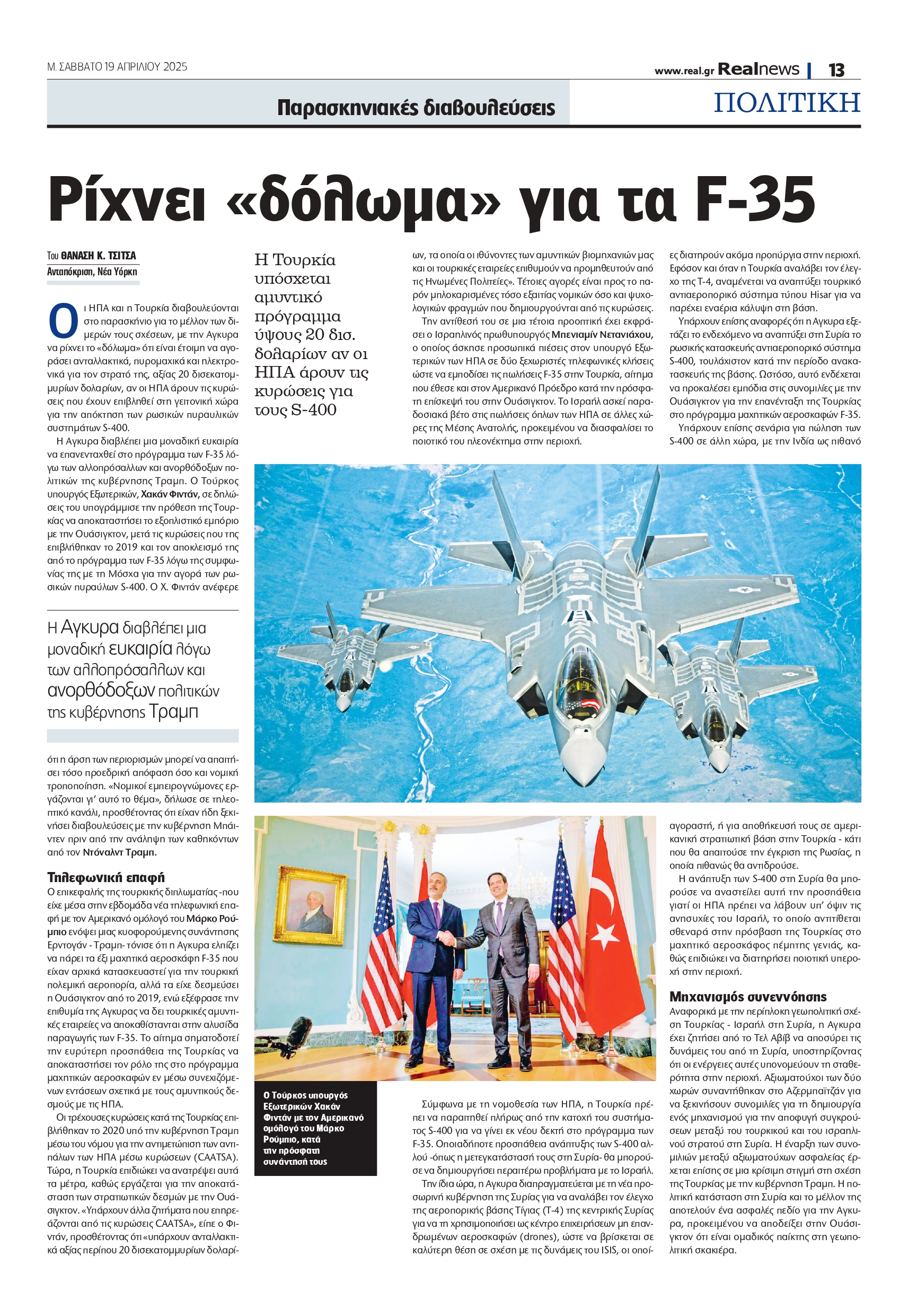 Ο Τούρκος υπουργός Εξωτερικών, Χακάν Φιντάν, σε δηλώσεις του υπογράμμισε την πρόθεση της Τουρκίας να αποκαταστήσει το εξοπλιστικό εμπόριο με την Ουάσιγκτον, μετά τις κυρώσεις που της επιβλήθηκαν το 2019 και τον αποκλεισμό της από το πρόγραμμα των F-35 λόγω της συμφωνίας της με τη Μόσχα για την αγορά των ρωσικών πυραύλων S-400.