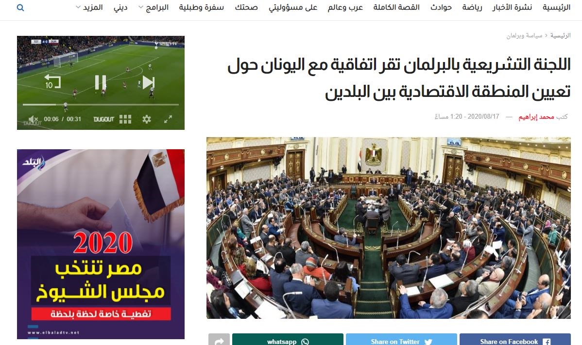 Η Συνταγματική και Νομοθετική Επιτροπή της Βουλής των Αντιπροσώπων στην Αίγυπτο ενέκρινε – βάσει του ρεπορτάζ της ιστοσελίδας, elbaladtv.net – τη συμφωνία της Κυβέρνησης της χώρας με την Ελλάδα σχετικά με τον καθορισμό ΑΟΖ μεταξύ των δύο χωρών. Στο ρεπορτάζ, ταυτόχρονα, σημειώνεται ότι βάσει του επεξηγηματικού μνημονίου, η συμφωνία καθιερώνει μερική οριοθέτηση των θαλάσσιων συνόρων μεταξύ των δύο χωρών και η οριοθέτηση αυτών των συνόρων θα ολοκληρωθεί όταν μέσω διαβουλεύσεων μεταξύ τους δύο χωρών βάσει του Διεθνούς Δικαίου.