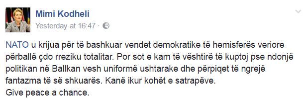 «Το ΝΑΤΟ δημιουργήθηκε για να ενώσει τις δημοκρατικές χώρες του βόρειου ημισφαιρίου απέναντι σε οποιαδήποτε απειλή. Όμως σήμερα δυσκολεύομαι να καταλάβω γιατί ο οποιοσδήποτε πολιτικός στα Βαλκάνια φορά στρατιωτική στολή και προσπαθεί να ξυπνήσει τα φαντάσματα του παρελθόντος. Έχουν παρέλθει οι εποχές των υπολοχαγών. Δώστε στην ειρήνη μία ευκαιρία» έγραψε η Μίμι Κοντέλι στο Facebook.