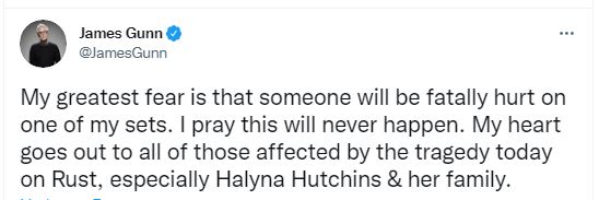 Ο μεγαλύτερος φόβος μου είναι ότι κάποιος θα τραυματιστεί θανάσιμο σε κάποιο από τα κινηματογραφικά μου σετ. Προσεύχομαι αυτό να μην συμβεί ποτέ. Η καρδιά μου πηγαίνει σ’ αυτούς που επηρεάζονται από την τραγωδία σήμερα στο Ραστ, ιδιαίτερα τη Halyna Hutchins και την οικογένειά της” έγραψε στην ανάρτησή του ο σκηνοθέτης των ταινιών “Εκδικητές: Η τελευταία πράξη”, “Ομάδα Αυτοκτονίας 2”, “Φύλακες του Γαλαξία 1& 2” και πολλών άλλων.