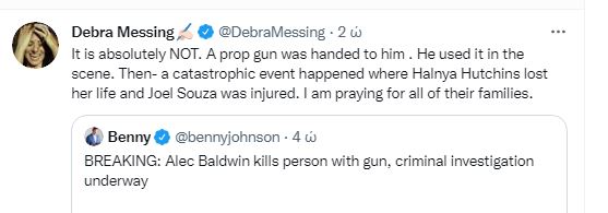 Η πρώην συμπρωταγωνίστρια του Μπάλντουιν, Ντέμπρα Μέσινγκ υπερασπίστηκε τον σταρ έπειτα από αρνητικό σχόλιο χρήστη στο twitter σχετικά με το δυστύχημα: “Του έδωσαν ένα πυροβόλο όπλο. Το χρησιμοποίησε στη σκηνή, Μετά συνέβη ένα καταστροφικό γεγονός όπου η Halyna Hutchins έχασε τη ζωή της και ο Joel Souza τραυματίστηκε. Προσεύχομαι για όλους στις οικογένειές τους”.