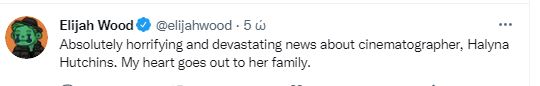 Ο σταρ του “Άρχοντα των Δαχτυλιδιών” Ελάιτζα Γουντ έγραψε, “εντελώς τρομακτικά και θλιβερά νέα για την κινηματογραφίστρια Halyna Hutchins. Οι σκέψεις μου είναι με την οικογένειά της”.