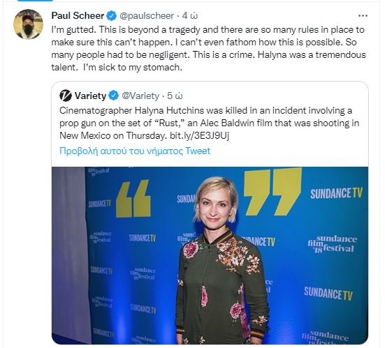 Ο ηθοποιός Paul Scheer χαρακτήρισε το δυστύχημα “τραγωδία και υπάρχουν τόσοι κανόνες για να διασφαλίσουμε ότι αυτό δεν θα συμβεί”. Όπως έγραψε “δεν μπορώ να καταλάβω πώς είναι αυτό δυνατό. Τόοι άνθρωποι έδειξαν τόση αμέλεια. Είναι έγκλημα. Η Halyna ήταν ένα εκπληκτικό ταλέντο. Έχω αρρωστήσει”.