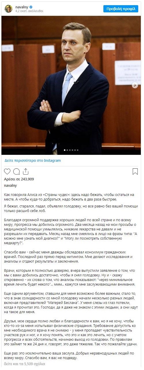 «Δεν αποσύρω το αίτημα να δω τον γιατρό που χρειάζεται, έχω απώλεια αίσθησης σε τμήματα των χεριών και των ποδιών μου… Δεδομένης της εξέλιξης αυτής και των συνθηκών αυτών, αρχίζω τον τερματισμό της απεργίας πείνας», έγραψε ο Αλεξέι Ναβάλνι σε μήνυμα που αναρτήθηκε στον λογαριασμό του στο Instagram.