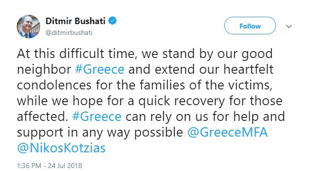 «Σε αυτές τις δύσκολες ώρες, στεκόμαστε δίπλα στον καλό γείτονά μας, την Ελλάδα και εκφράζουμε τα ειλικρινή συλλυπητήριά μας για τις οικογένειες των θυμάτων» γράφει στον προσωπικό λογαριασμό του στο Twitter ο Αλβανός υπουργός Εξωτερικών, Ντιτμίρ Μπουσάτι.