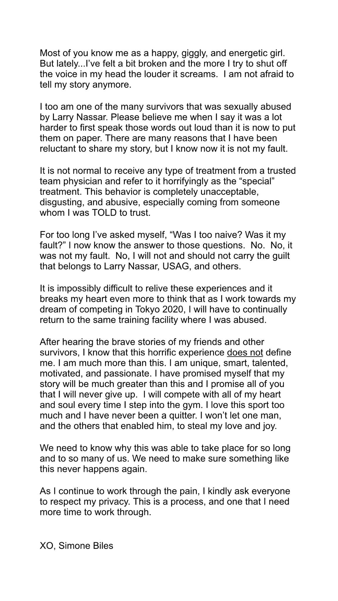 Αγαπώ αυτό το άθλημα και δεν τα έχω παρατήσει ποτέ. Δεν πρόκειται να αφήσω έναν άντρα, και όσους του το επέτρεψαν, να κλέψει την αγάπη και τη χαρά μου. Πρέπει να μάθουμε γιατί συνέβη αυτό και για τόσο μεγάλο χρονικό διάστημα, σε τόσες πολλές από εμάς. Πρέπει να είμαστε σίγουροι ότι κάτι τέτοιο δεν θα ξανασυμβεί. Όσο προσπαθώ να ανταπεξέλθω στον πόνο, ζητώ από όλους ευγενικά να σεβαστούν την προσωπική μου ζωή».