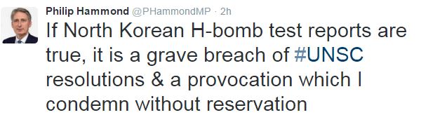 Μια δοκιμή μιας βόμβας υδρογόνου από τη Βόρεια Κορέα θα συνιστούσε μια “πρόκληση που καταδικάζω ανεπιφύλακτα” και μια “σοβαρή παραβίαση” των αποφάσεων του Συμβουλίου Ασφαλείας του ΟΗΕ, δήλωσε σήμερα ο υπουργός Εξωτερικών της Βρετανίας Φίλιπ Χάμοντ.