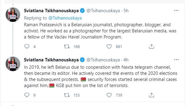 Η Λευκορωσία ανέπτυξε χθες Κυριακή καταδιωκτικό για να αναχαιτίσει το Boeing 737. Ο ιστότοπος της λευκορωσικής αντιπολίτευσης Nexta ανέφερε ότι ο πρώην διευθυντής του Ρομάν Προτάσεβιτς, που επέβαινε στο αεροσκάφος, συνελήφθη όταν αυτό προσγειώθηκε στο Μινσκ, πληροφορία που επιβεβαίωσε αργότερα η λευκορωσική κρατική τηλεόραση.