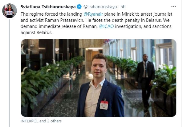 Η Λευκορωσία έστειλε χθες Κυριακή καταδιωκτικό της Πολεμικής Αεροπορίας της να αναχαιτίσει το Boeing 737. Ο ιστότοπος της λευκορωσικής αντιπολίτευσης Nexta ανέφερε ότι ο πρώην διευθυντής του Ρομάν Προτάσεβιτς, που επέβαινε στο αεροσκάφος, συνελήφθη όταν αυτό προσγειώθηκε στο Μινσκ, πληροφορία που επιβεβαίωσε αργότερα η λευκορωσική κρατική τηλεόραση.