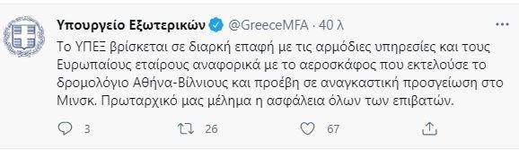 Το υπουργείο Εξωτερικών της Ελλάδας, αρχικά μέσω twitter, ανακοίνωσε ότι “βρίσκεται σε διαρκή επαφή με τις αρμόδιες υπηρεσίες και τους Ευρωπαίους εταίρους αναφορικά με το αεροσκάφος που εκτελούσε το δρομολόγιο Αθήνα-Βίλνιους και προέβη σε αναγκαστική προσγείωση στο Μινσκ. Πρωταρχικό μας μέλημα η ασφάλεια όλων των επιβατών”.