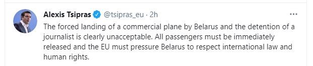 Ο πρόεδρος του ΣΥΡΙΖΑ, σημειώνει σε ανάρτησή του ότι “η αναγκαστική προσγείωση ενός εμπορικού αεροπλάνου από τη Λευκορωσία και η κράτηση ενός δημοσιογράφου είναι σαφώς απαράδεκτη. Όλοι οι επιβάτες πρέπει να απελευθερωθούν αμέσως και η ΕΕ πρέπει να πιέσει τη Λευκορωσία να σεβαστεί το διεθνές δίκαιο και τα ανθρώπινα δικαιώματα”.