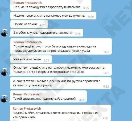 Σύμφωνα με ακτιβιστικές οργανώσεις στη Λευκορωσία, μέλη της λευκορωσικής μυστικής υπηρεσίας KGB επιβιβάστηκαν στο αεροσκάφος της Ryanair στην Αθήνα, που απογειώθηκε με προορισμό το Βίλνιους της Λιθουανίας και το ανάγκασαν να προσγειωθεί στο αεροδρόμιο του Μινσκ. Σύμφωνα με το “Mogilev Online”, φεέρεται να είχε πει σε συναδέλφους του, νωρίτερα σήμερα, ότι ενώ βρισκόταν στο αεροδρόμιο της Αθήνας παρατήρησε ότι τον παρακολουθούσε ένας μεσήλικας που μιλούσε ρωσικά, Πρώτα, προσπάθησε να φωτογραφίσει τα ταξιδιωτικά έγγραφα του δημοσιογράφου και μετά έφυγε αν και ήταν ο επόμενος στην ουρά για να τσεκάρει τα στοιχεία του.