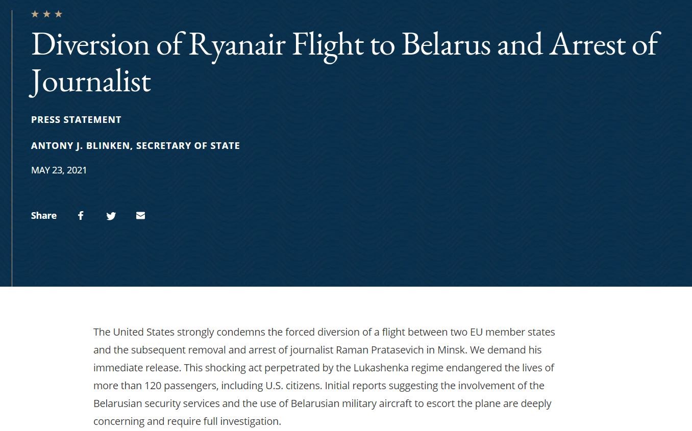 Σε ανακοίνωση Τύπου που δημοσιοποίησε το Στέιτ Ντιπάρτμεντ, ο Αμερικανός ΥΠΕΞ Άντονι Μπλίνκεν ζητεί την άμεση απελευθέρωση του δημοσιογράφου Ρομάν Προτασέβιτς, ενώ τονίζει πως «η σοκαριστική ενέργεια που διαπράχθηκε από το καθεστώς Λουκασένκο έθεσε σε κίνδυνο τη ζωή 120 και πλέον επιβατών, συμπεριλαμβανομένων πολιτών των ΗΠΑ».