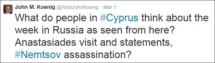 «Τι σκέφτονται οι Κύπριοι για την εβδομάδα στη Ρωσία, όπως την είδαμε από εδώ; Την επίσκεψη Αναστασιάδη και τις δηλώσεις και τη δολοφονία Νεμτσόφ;», έγραψε ο πρέσβης στο twitter ξεσηκώνοντας θύελλα αντιδράσεων καθώς κάποιοι σχολίασαν ότι συνέδεσε την επίσκεψη του Νίκου Αναστασιάδη με τη δολοφονία του Νεμτσόφ.