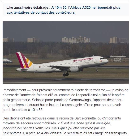 Σύμφωνα με τη γαλλική εφημερίδα, ο πιλότος δεν εξέπεμψε σήμα κινδύνου, ενώ από την ώρα που χάθηκε το σήμα του αεροσκάφους μέχρι και τη συντριβή στις Γαλλικές Άλπεις, ο Πύργος Ελέγχου καλούσε συνεχώς τον πιλότο. Όμως εκείνος δεν αποκρινόταν με αποτέλεσμα να σηκωθούν για την αποφυγή τρομοκρατικής πράξης ένα πολεμικό αεροσκάφος και ένα ελικόπτερο της χωροφυλακής, τα οποία προσέγγισαν το σημείο.