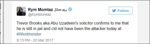 Δεν είναι τελικά ο Τρέβορ Μπρουκς ο δράστης της τρομοκρατικής επίθεσης έξω από το Βρετανικό Κοινοβούλιο; Αυτό υποστηρίζουν δημοσιογράφοι με αναρτήσεις τους στο Twitter που διαψεύδουν τα διεθνή ΜΜΕ, τα οποία ανέφεραν ότι ο γνωστός ως Αμπού Ιζαντίν, σκόρπισε το θάνατο στην καρδιά του Λονδίνου.