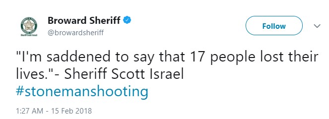 Όσο περνά η ώρα ο τραγικός απολογισμός της σφαγής στο λύκειο Stoneman Douglas στο Πάρκλαντ της Φλόριντα δυστυχώς αυξάνεται. Πριν από λίγα λεπτά ο τοπικός σερίφης ανακοίνωσε μέσω Twitter ότι οι νεκροί έχουν φθάσει τους 17.