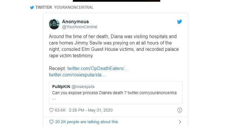 Σύμφωνα με tweet της ομάδας «Anonymous», η πριγκίπισσα Νταϊάνα είχε μάθει για ένα κύκλωμα trafficking στο οποίο εμπλεκόταν η βασιλική οικογένεια της Βρετανίας και προσπαθούσε να συλλέξει μαρτυρίες θυμάτων για να αποκαλύψει τα έκτροπα.Οι «Αnonymous» ισχυρίζονται ότι η βασιλική οικογένεια της Βρετανίας δολοφόνησε την Νταϊάνα στις 31 Αυγούστου του 1997 κι ότι το αυτοκινητιστικό δυστύχημα ήταν στημένο.