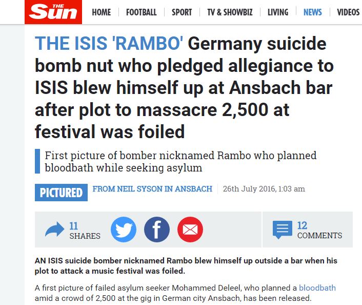 Με το κωδικό όνομα «Ράμπο» ήταν γνωστός στο εσωτερικό του Ισλαμικού Κράτους ο βομβιστής του Άνσμπαχ, Μοχαμάντ Νταλέελ, ο οποίος σύμφωνα με ρεπορτάζ της Sun σχεδίαζε «λουτρό αίματος» στο μουσικό φεστιβάλ της βαυαρικής πόλης.