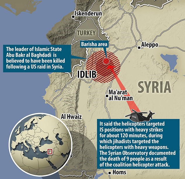 Ο ίδιος ο Μπαγκντάντι φέρεται να ανατινάχτηκε μαζί με τον προσωπικό του σωματοφύλακα στο κρησφύγετό του στην Ιντλίμπ στη διάρκεια της επιδρομής.