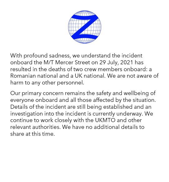 «…Μια έρευνα για το περιστατικό βρίσκεται αυτή τη στιγμή σε εξέλιξη. Συνεχίζουμε να εργαζόμαστε στενά με την UKMTO και άλλες σχετιζόμενες αρχές», σημείωσε η εταιρεία Zodiac, ιδιοκτησίας του Ισραηλινού επιχειρηματία Εγιάλ Οφέρ, ο οποίος βρίσκεται στην 197η θέση της κατάταξης των πλουσιότερων ανθρώπων του Forbes, με περιουσία που εκτιμάται στα 11,3 δισεκατομμύρια δολάρια. Επεσήμανε πως «δεν έχει γνώση για κάποιον τραυματισμό μεταξύ άλλων μελών του προσωπικού», πέραν των μελών του πληρώματος από τη Βρετανία και τη Ρουμανία που σκοτώθηκαν. Η UKMTO είπε ότι το δεξαμενόπλοιο έπλεε σε απόσταση 152 ναυτικών μιλίων βορειοανατολικά του λιμανιού Ντουκμ του Ομάν, όταν δέχθηκε την επίθεση. Σύμφωνα με τη Zodiac, το πλοίο ταξιδεύει τώρα υπό τον έλεγχο του πληρώματός του προς έναν ασφαλή προορισμό, με τη συνοδεία ενός πολεμικού πλοίου των ΗΠΑ.