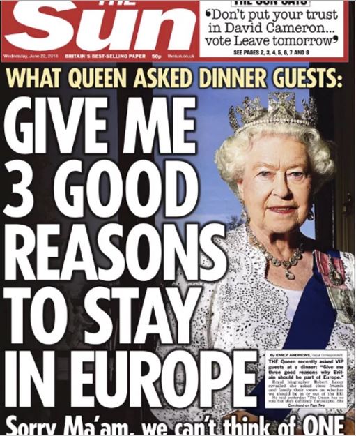 Σύμφωνα με τα βρετανικά ΜΜΕ, δεν είναι η πρώτη φορά που η εφημερίδα στο πρωτοσέλιδο της φιλοξενεί την βασίλισσα Ελισάβετ για να πάρει θέση στο δημοψήφισμα που θα κρίνει την παραμονή ή όχι της Βρετανίας στην ΕΕ.