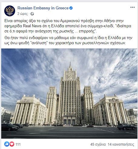 “Είναι απορίας άξιο το σχόλιο του Αμερικανού πρέσβη στην Αθήνα στην εφημερίδα Real News ότι η Ελλάδα αποτελεί ένα σύμμαχο-κλειδί, “ιδιαίτερα σε ό,τι αφορά την ανάσχεση της ρωσικής … επιρροής”. Θα ήταν πολύ ενδιαφέρον να μάθουμε εάν συμφωνεί η ίδια η Ελλάδα με την ως άνω ψευδή “ανάλυση” του χαρακτήρα των ρωσοελληνικών σχέσεων” σημειώνεται στην ανάρτηση της πρεσβείας της Ρωσίας.