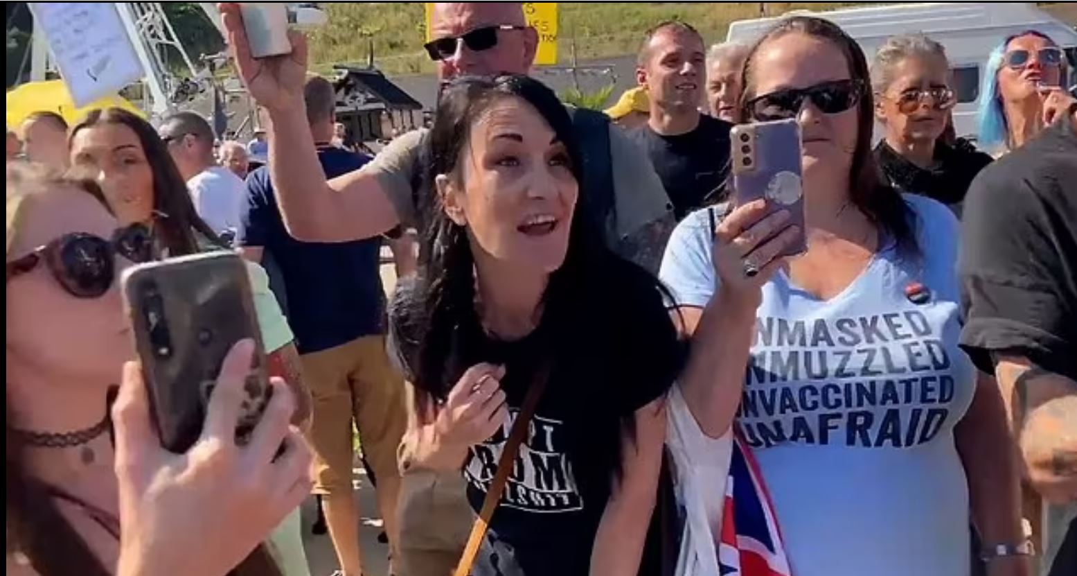 “Θα έρθει μια στιγμή που θα αποδοθεί δικαιοσύνη. Οι δίκες της Νυρεμβέργης έρχονται την 1η Σεπτεμβρίου… και θα σας κρεμάσουν όλους”. Ο άνδρας υπό τα επιφωνήματα των υπόλοιπων αντιεμβολιαστών συνεχίζει να αναφέρεται στις δίκες της Νυρεμβέργης.