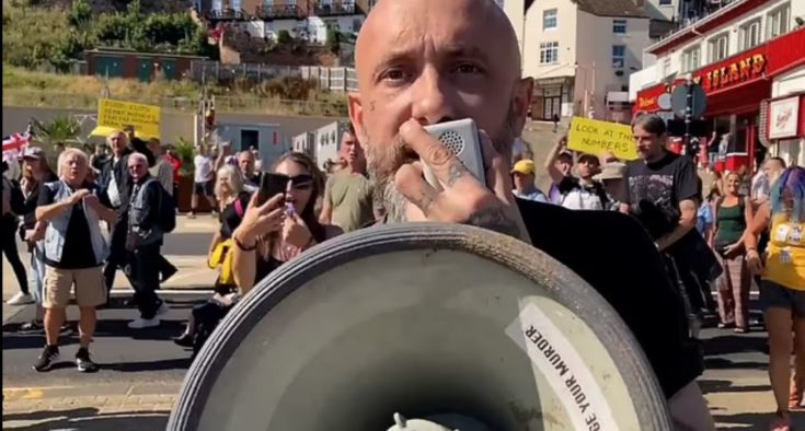 “Θα έρθει μια στιγμή που θα αποδοθεί δικαιοσύνη. Οι δίκες της Νυρεμβέργης έρχονται την 1η Σεπτεμβρίου… και θα σας κρεμάσουν όλους”. Ο άνδρας υπό τα επιφωνήματα των υπόλοιπων αντιεμβολιαστών συνεχίζει να αναφέρεται στις δίκες της Νυρεμβέργης.