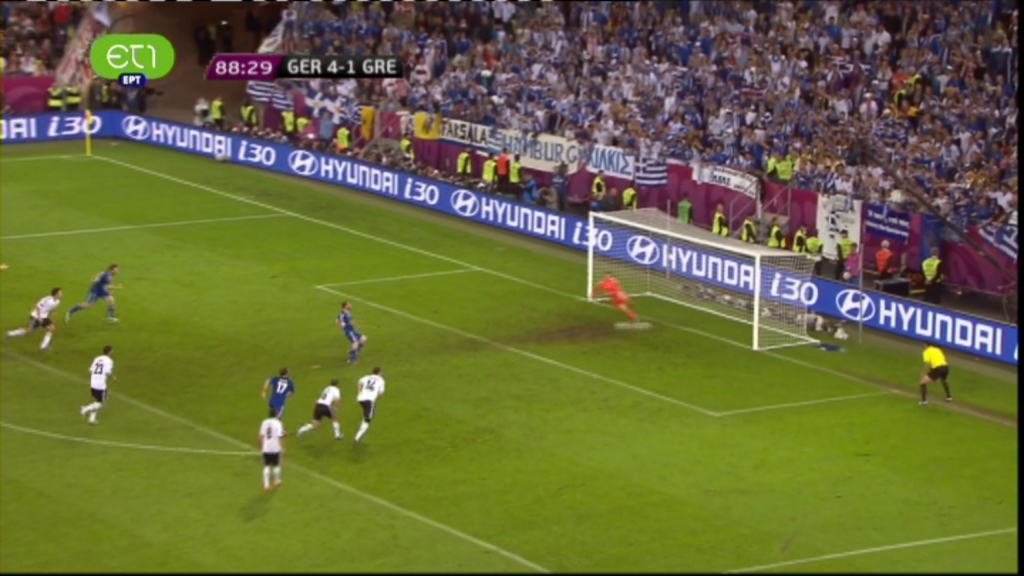 Το σκορ άνοιξε για τα “πάντσερ” ο Λαμ στο 39′. Για την Εθνική μας ισοφάρισε στο 55′ ο Γιώργος Σαμαράς.Καταιγιστικοί από εκείνο το σημείο και μετά οι Γερμανοί, προηγήθηκαν εκ νέου στο 61′ με τον Κεντίρα. Το 2-1 έκανε επτά λεπτά αργότερα ο Μίροσλαβ Κλόζε, ενώ διαστάσεις θριάμβου στη νίκη της νασιολαμανσάφτ έδωσε στο 74′ ο Ρόις.