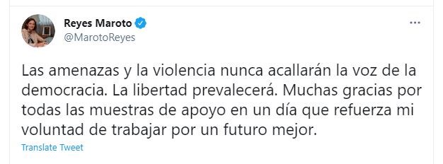 Η ίδια η Μαρότο με ανάρτησή της στο twitter γράφει: “Οι απειλές και η βία ποτέ δεν θα σιγήσουν τη φωνή της Δημοκρατίας. Η ελευθερία θα επικρατήσει. Σας ευχαριστώ πολύ για όλα τα μηνύματα στήριξης σε μία μέρα που ενισχύεται η θέλησή μου να εργαστώ για ένα καλύτερο μέλλον”.