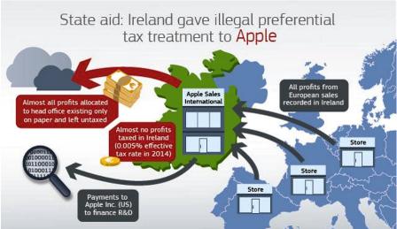 Η Κομισιόν μετά από έρευνα κατέληξε στο συμπέρασμα ότι η Ιρλανδία επέτρεψε στην Apple να πληρώσει πολύ λιγότερους φόρους από τις άλλες επιχειρήσεις, μόλις 1% το 2003 και 0,005% το 2014. Αυτό κατέστη δυνατό μέσω δύο ειδικών συμφωνιών μεταξύ του Ιρλανδικού κράτους από το 1991.