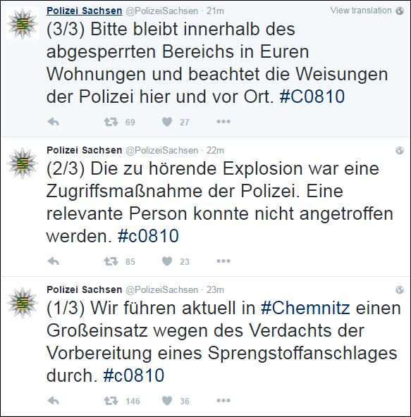 Η αστυνομία του Σάχσεν επιβεβαίωσε το ρεπορτάζ της Bild και σε tweets στον επίσημο λογαριασμό της ανέφερε ότι αποφεύχθηκε έκρηξη βόμβας σε μπλοκ κατοικιών στο Κέμνιτς επισημαίνοντας πως βρίσκεται σε εξέλιξη μεγάλη επιχείρηση για τον εντοπισμό ενός ατόμου.