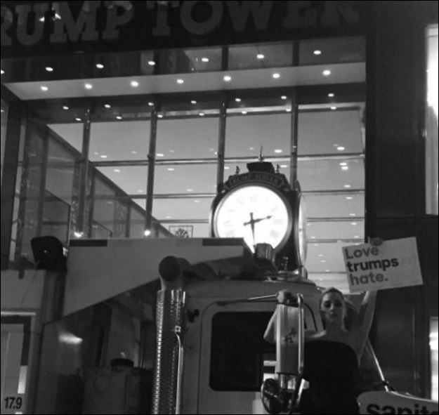 Η Lady Gaga πήγε έως τον ουρανοξύστη Τραμπ στο Μανχάταν νωρίτερα σήμερα και ανήρτησε μια φωτογραφία στο Instagram, όπου απεικονίζεται η ίδια να κρατάει μία αφίσα με το σύνθημα «Love trumps hate» (η αγάπη κερδίζει το μίσος).
