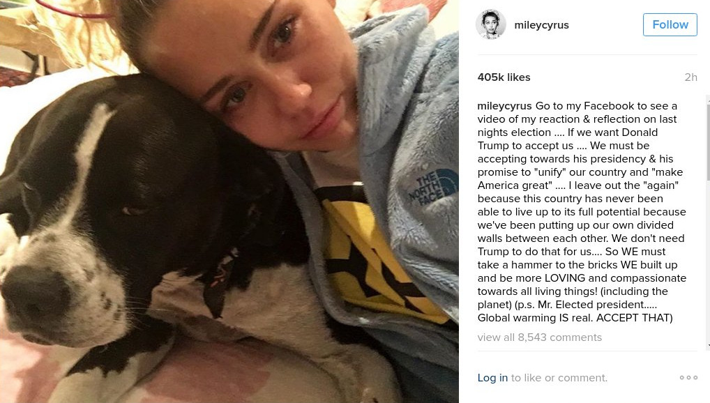 Με δάκρυα στα μάτια, η Μάιλι Σάιρους ανήρτησε ένα βίντεο στους ιστότοπους κοινωνικής δικτύωσης, όπου επισήμανε ότι δεν είχε κοιμηθεί εξαιτίας της ήττας της Χίλαρι Κλίντον. Ωστόσο, η 23χρονη τραγουδίστρια, η οποία νωρίτερα αυτόν το μήνα είχε δηλώσει ότι θα εγκαταλείψει την χώρα εάν κερδίσει ο Ντόναλντ Τραμπ, απηύθυνε έκκληση για ενότητα και επισήμανε: «Ντόναλντ Τραμπ, σε αποδέχομαι ως Πρόεδρο των ΗΠΑ… Σε παρακαλώ συμπεριφέρσου στους πολίτες με συμπόνια και σεβασμό».