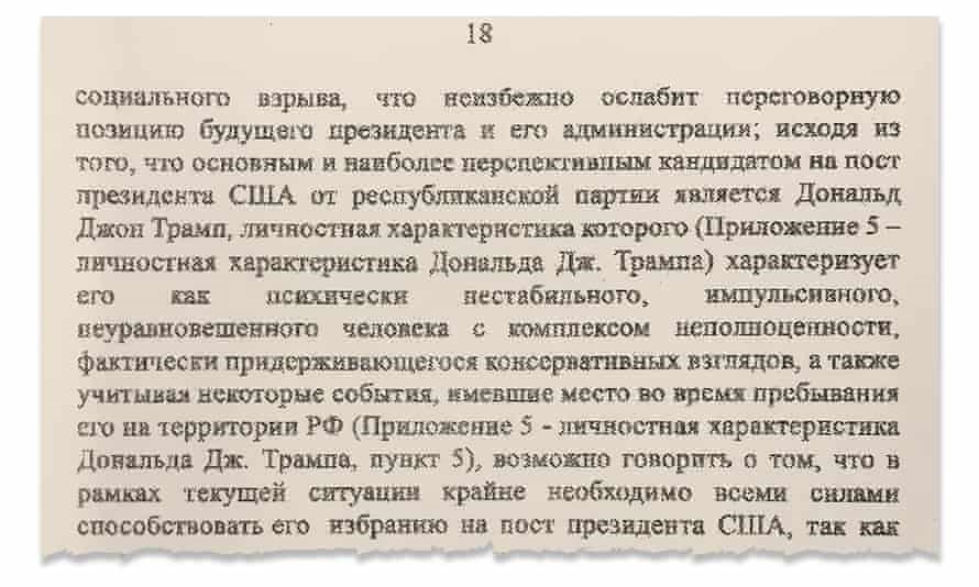 Στην έκθεση «Νο 32-04 \ vd» που χαρακτηρίζεται ως απόρρητη, ο Τραμπ αναφέρεται ως ο «πιο υποσχόμενος υποψήφιος» για το καλό του Κρεμλίνου, με τη λέξη στα ρωσικά να είναι «perspektivny». Υπάρχει επίσης επιβεβαίωση ότι το Κρεμλίνο διαθέτει «kompromat», δηλαδή αποδεικτικά ενοχοποιητικά στοιχεία για τον Ντόναλντ Τραμπ. Τα στοιχεία αυτά, σημειώνεται στο έγγραφο, συλλέχθηκαν από προηγούμενες «μη επίσημες επισκέψεις του Τραμπ στο έδαφος της Ρωσικής Ομοσπονδίας». Γίνεται μάλιστα αναφορά σε «συγκεκριμένα γεγονότα» που συνέβησαν κατά τη διάρκεια των ταξιδιών του Τραμπ στη Μόσχα.