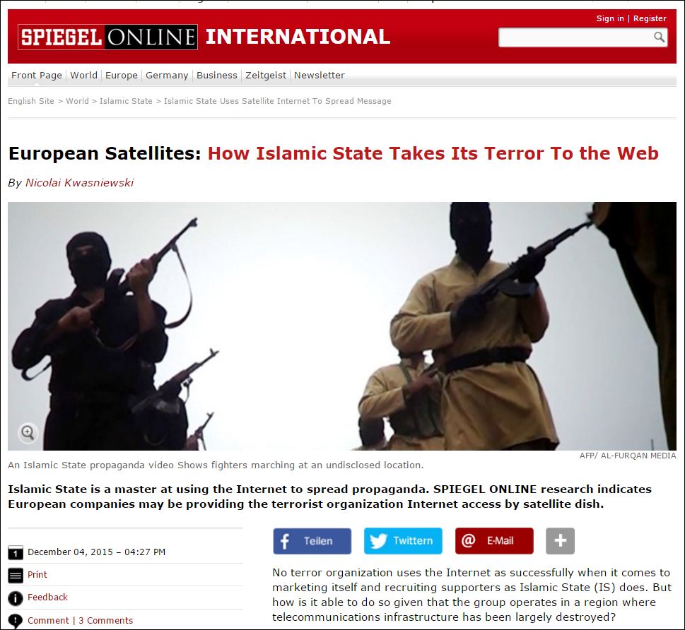 Μία αποκάλυψη που σοκάρει φέρνει στο φως της δημοσιότητας το Spiegel. Σε ρεπορτάζ υπό τον τίτλο: «Οι ευρωπαϊκοί δορυφόροι: Πως το Ισλαμικό Κράτος τρομοκρατεί μέσω διαδικτύου» το Spiegel αναφέρει ότι οι τζιχαντιστές χρησιμοποιούν τους ευρωπαϊκούς δορυφόρους για να έχουν πρόσβαση στο ίντερνετ.