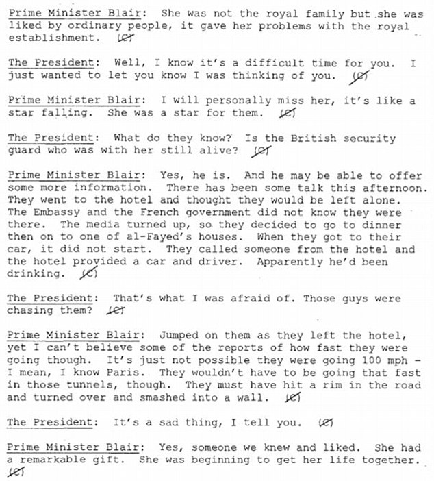 «Δεν ήταν σαν τη βασιλική οικογένεια, αλλά άρεσε στους απλούς ανθρώπους. Προσωπικά θα μου λείψει», είπε ο Μπλερ στον τότε Αμερικανό πρόεδρο, μία ημέρα με το θάνατο της πριγκίπισσας.