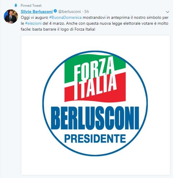 Ο Ιταλός κεντροδεξιός πρώην πρωθυπουργός έγραψε χαρακτηριστικά: «θέλω να σας ευχηθώ καλή Κυριακή, παρουσιάζοντας για πρώτη φορά το σύμβολό μας για τις εκλογές της 4ης Μαρτίου. Και με αυτό τον νέο εκλογικό νόμο είναι πολύ εύκολο να ψηφίσετε. Φτάνει να σταυρώσετε το λογότυπο της Φόρτσα Ιτάλια».