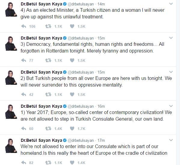 Επίθεση στην Ευρώπη εξαπέλυσε μέσω Twitter η υπουργός Οικογενειακών Υποθέσεων της Τουρκίας Φατμά Μπετούλ Σαγιάν Καγιά, η οποία έφθασε οδικώς στο Ρότερνταμ από τη Γερμανία όπου βρισκόταν, αλλά η ολλανδική αστυνομία εμπόδισε την είσοδο της στο τουρκικό προξενείο της πόλης.«Δεν μας επιτρέπεται η είσοδος στο προξενείο μας που είναι μέρος της πατρίδας μας. Είναι αλήθεια αυτή η καρδιά της Ευρώπης που είναι λίκνο του πολιτισμού», έγραψε στο πρώτο της tweet η υπουργός.Εν συνεχεία σε δεύτερη ανάρτηση ανέφερε: «Έτος 2017; Η Ευρώπη, το λεγόμενο κέντρο του σύγχρονου πολιτικού. Δεν μας επιτρέπεται η είσοδος στο Γενικό Προξενείο, τη δική μας γη» για να συμπληρώσει: «Αλλά ο τουρκικός λαός από όλη την Ευρώπη είναι εδώ μαζί μας και εμείς ποτέ δεν θα παραδοθούμε σε αυτή την καταπιεστική νοοτροπία».«Η Δημοκρατία, τα θεμελιώδη δικαιώματα, τα ανθρώπινα δικαιώματα και οι ελευθερίες, όλα ξεχασμένα απόψε στο Ρότερνταμ. Απλά τυρρανία και καταπίεση», έγραψε σε 3ο tweet για να ολοκληρώσει την επίθεση της στην Ευρώπη αναφέροντας: «Ως εκλεγμένη υπουργός, ως πολίτης της Τουρκίας και ως γυναίκα δεν θα τα παρατήσω ποτέ κόντρα σε αυτή την παράνομη αντιμετώπιση».Δείτε τα tweets: