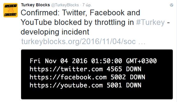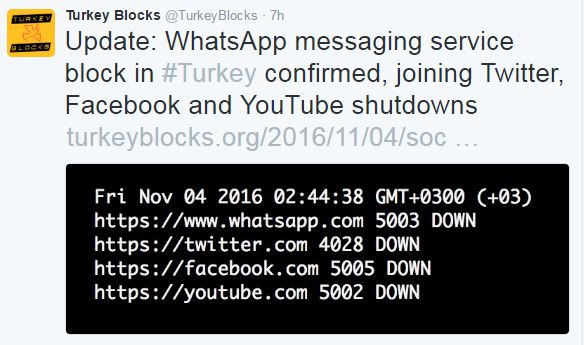 Η πρόσβαση στις σελίδες των μέσων κοινωνικής δικτύωσης Twitter και Whatsapp αποκλείστηκε σήμερα στην Τουρκία, σύμφωνα με οργάνωση που παρακολουθεί τη λειτουργία του διαδικτύου και των μέσων κοινωνικής δικτύωσης στη χώρα.