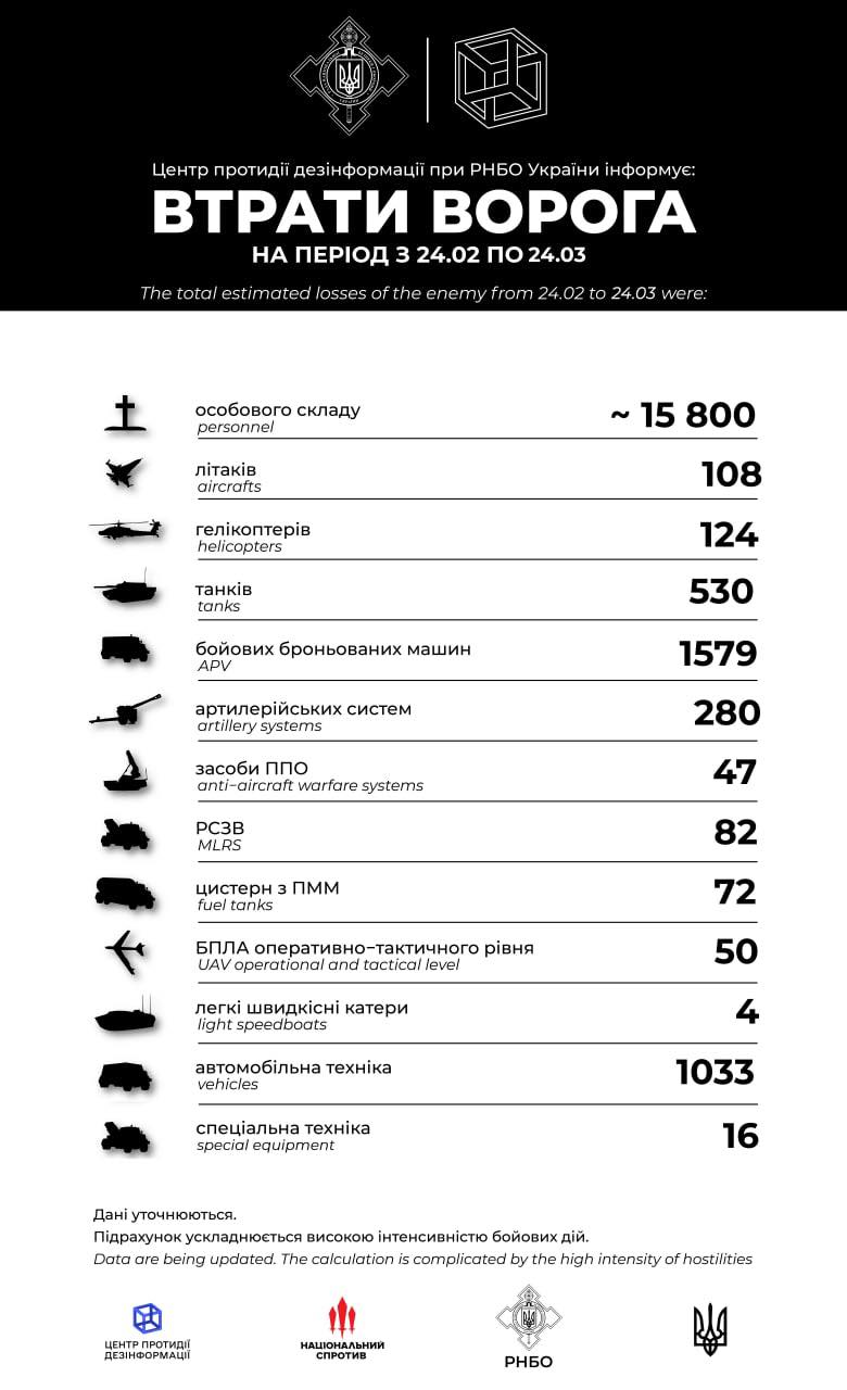 Σύμφωνα με τους Ουκρανούς περίπου 15.800 Ρώσοι στρατιώτες έχουν χάσει τη ζωή τους στα μέτωπα των μαχών. 108 μαχητικά αεροσκάφη και 124 ελικόπτερα έχουν καταρριφθεί μαζί με 50 ρωσικά drones. Οι απώλειες είναι μεγάλες και στις χερσαίες δυνάμεις.530 τανκς, 1579 οχήματα μεταφοράς προσωπικού, 280 πυροβόλα, 47 αντιαεροπορικά συστήματα και 82 πολλαπλοί εκτοξευτές MLRS έχουν καταστραφεί.