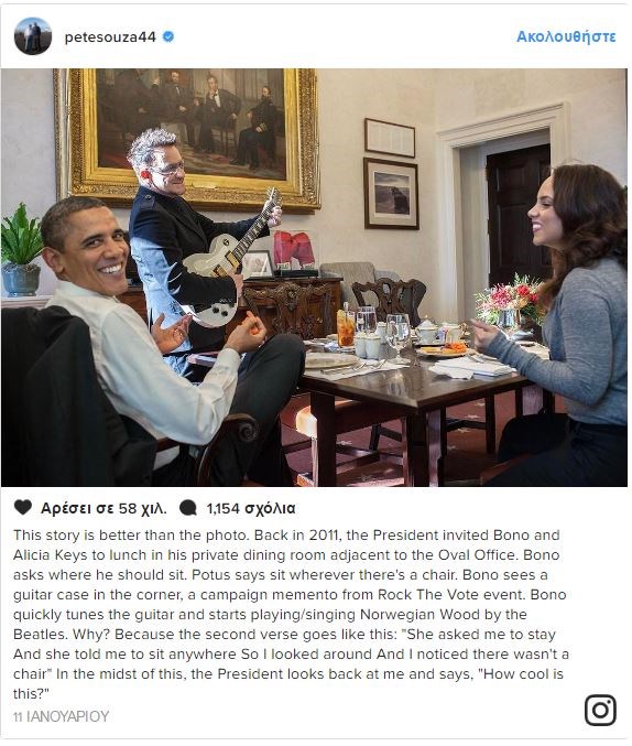 Το ζεύγος Ομπάμα, χαμογελαστό χαιρέτισε τον κόσμο που είχε μαζευτεί έξω από το μαγαζί. Τον Bono, συνόδευε η 27χρονη κόρη του Jordan. Δεν είναι η πρώτη φορά που ο Μπαράκ Ομπάμα και ο Bono συναντιούνται. Ως πρόεδρος, ο Ομπάμα είχε καλέσει τον τραγουδιστή των U2 μαζί με την Αλίσια Κις στον Λευκό Οίκο, το 2011, και γευμάτισαν στην ιδιωτική τραπεζαρία του, δίπλα στο Οβάλ γραφείο.Όπως είχε αποκαλύψει τότε ο φωτογράφος του Λευκού Οίκου, Πιτ Σούζα, ο Bono είχε παίξει τραγούδι των Beatles για τον Ομπάμα. Επίσης, το 2013, κατά την επίσκεψή του στην Ιρλανδία, ο πρώην Πρόεδρος με τη σύζυγο και τις κόρες του είχαν γευματίσει με την οικογένεια του Bono.
