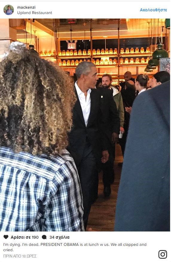 Με τον τραγουδιστή των U2 Bono, γευμάτισαν οι Μπαράκ και Μισέλ Ομπάμα.Ο πρώην Πρόεδρος των ΗΠΑ με τη σύζυγό του και ο διάσημος τραγουδιστής απόλαυσαν το γεύμα τους σε ιδιωτικό δωμάτιο, σε εστιατόριο στο Μανχάταν. Την ώρα που περνούσαν από τον χώρο όπου βρίσκονταν οι υπόλοιποι πελάτες, όλοι σηκώθηκαν όρθιοι, ζητωκραύγαζαν και τους χειροκροτούσαν, ενώ μία γυναίκα ακούστηκε να φωνάζει «Ομπάμα, σε αγαπάμε!»