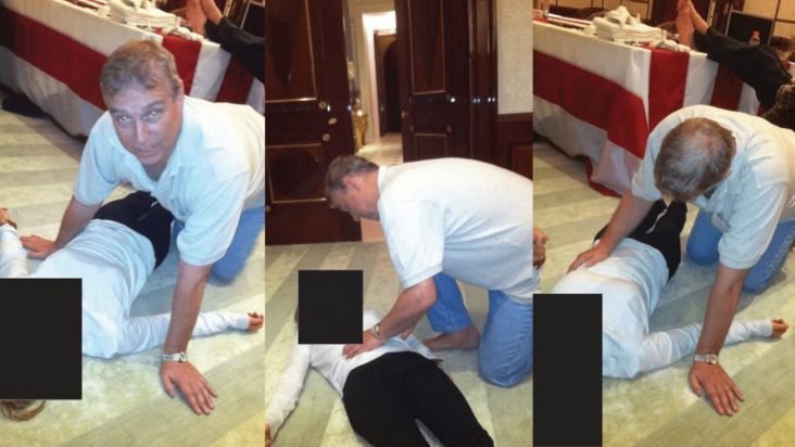 Στις τρεις φωτογραφίες που δημοσιεύει η DailyMail, ένας άνδρας που πιστεύεται ότι είναι ο πρίγκιπας Άντριου φαίνεται να σκύβει πάνω από τη γυναίκα που είναι ξαπλωμένη με το πρόσωπο προς τα πάνω και τα χέρια απλωμένα.