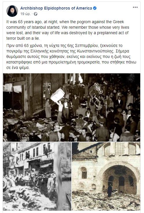 Με μία ανάρτησή του στα μέσα κοινωνικής δικτύωσης ο Αρχιεπίσκοπος Αμερικής Ελπιδοφόρος αναφέρεται στην επέτειο του πογκρόμ του Ελληνισμού της Κωνσταντινούπολης, την 6η Σεπτεμβρίου 1955.