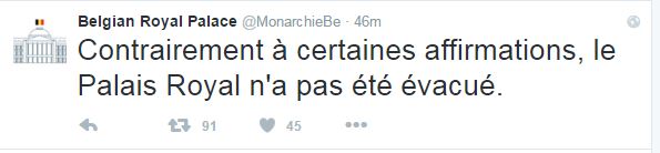 «Αντίθετα με κάποιες αναφορές, τα ανάκτορα δεν έχουν εκκενωθεί», ανέφερε το μήνυμα στο twitter. Νωρίτερα, το δίκτυο RTBF μετέδωσε ότι ο Βασιλιάς Φίλιππος και η Βασίλισσα Ματθίλδη έχουν συγκλονιστεί και ότι τα ανάκτορα έχουν εκκενωθεί.