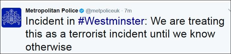 Με ανακοίνωσή της στον λογαριασμό της στο Twitter, η Αστυνομία του Λονδίνου αντιμετωπίζει το συμβάν ως τρομοκρατική επίθεση.